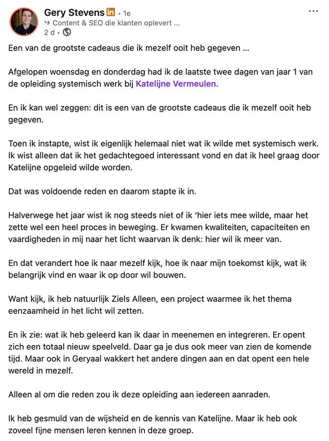 De opleiding is een absolute aanrader voor iedereen die zijn kennis wil verbreden en verdiepen. Wat deze opleiding zo waardevol maakt, is dat je direct de geleerde methodes en werkvormen kunt toepassen in je eigen werk. Katelijne reikt concrete en praktische tools aan waarmee je meteen aan de slag kunt. Ik ben enorm dankbaar voor deze leerervaring en kan de opleiding van Katelijne Vermeulen van harte aanbevelen.”